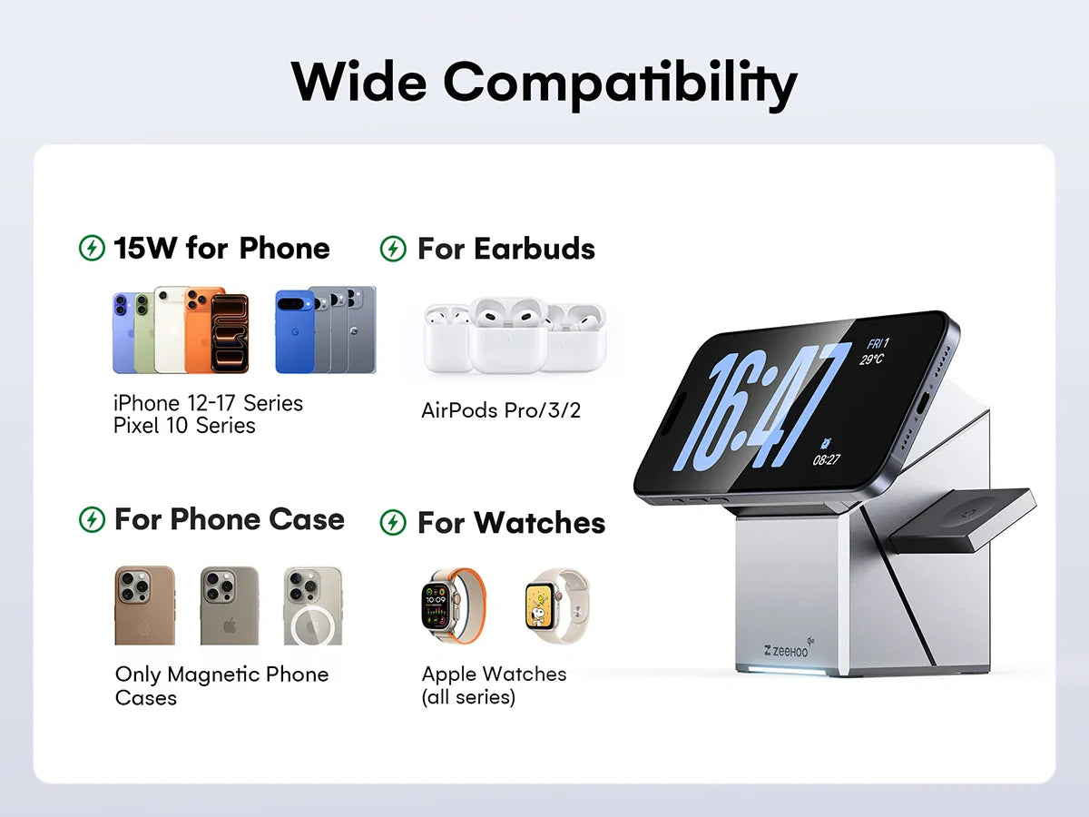 Charge iPhone 12-17(also supports any wireless charging-enabled phone, but magnetic alignment requires a MagSafe-compatible or magnetic case), Apple Watch Series 9/Ultra, and Air Pods Pro 3 in one go. No adapters needed—just place and power up. And the latest versions of each device.